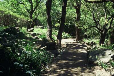 Oak Woodlands occur on a variety of hilly habitats where there's no summer water and conditions remain warm to hot and sunny most of the day. When gardening under oaks like these Coast Live Oaks (Quercus agrifolia), be sure to use shrubs, perennials, and ferns that are drought tolerant. A perfect example is the massed white blossoms of the 'Canyon Snow' cultivar of Douglas Iris (Iris douglasiana).