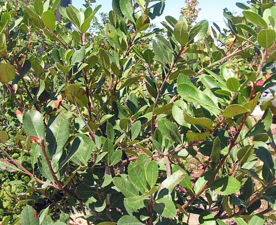 Large evergreen shrub or small tree useful as a specimen, hedge, foundation shrub, or barrier plant. Features large, leathery, hollylike leaves, masses of white flowers in summer, and bright red fruits in fall.